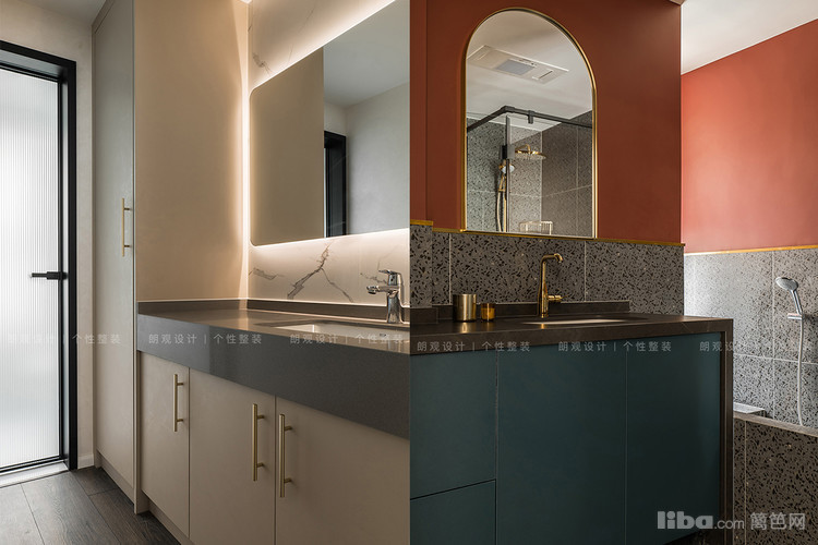 主卫墙面运用了灰色水磨石和橘调防水涂漆,金属条将两种材料拼接在一起,解决收口问题,并与金属边框的拱形镜完美融合,不仅复古腔调十足,还让空间有一种艺术设计感。