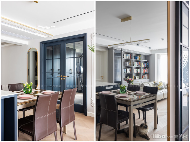 从餐厅看向主卧,卧室双开门特意选择了与中岛柜相似的颜色做门套,色彩上呼应,维护整一性。