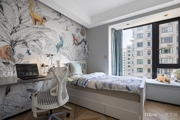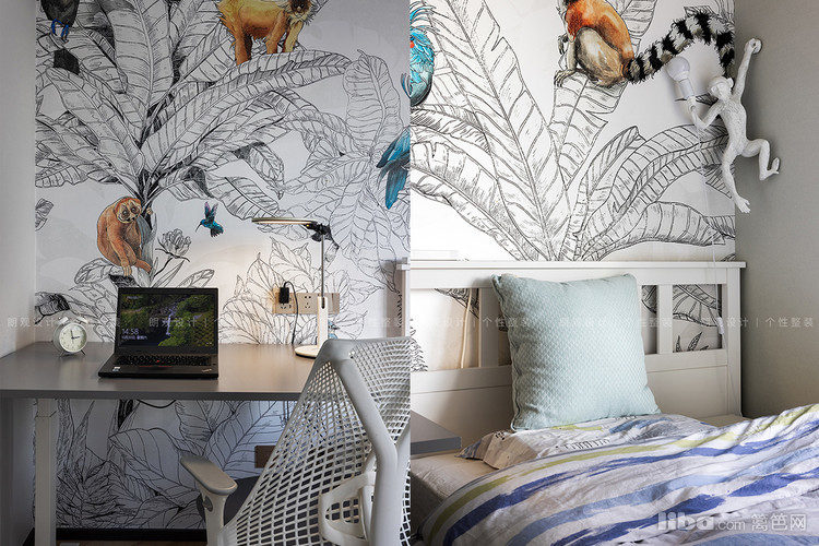 因为宝宝属猴,所以儿童房特意选了有小猴子元素的壁布做床背景,搭配白色的床体,配色明亮灵动。