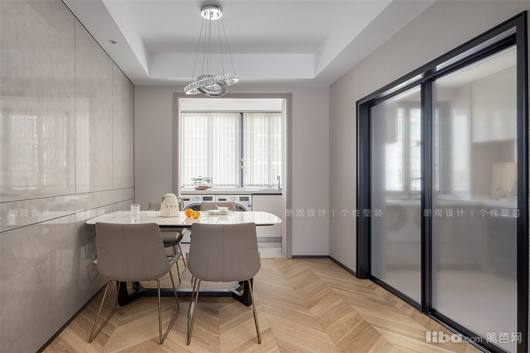 餐厅墙面饰以护墙板,透亮的质地与餐桌相呼应,间接起到提升空间亮度的作用。