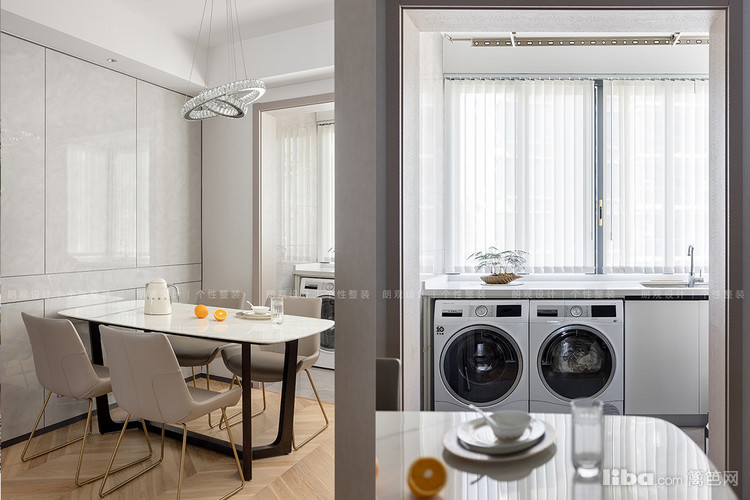 北阳台临近餐厨,被赋予洗衣房的功能,洗烘机、水池、墩布洗涮池等一应俱全