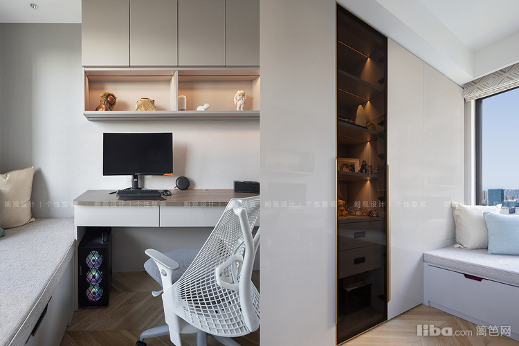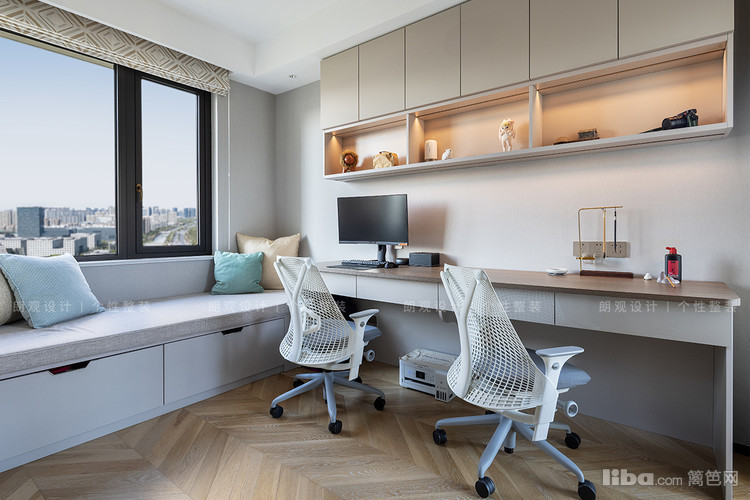 书房集工作区、休闲区和储物功能为一体,双人书桌和超长吊柜满足业主的工作需求。