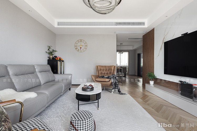 地面采用地板鱼骨铺贴,通过鱼骨纹的色彩与丰富的纹理让空间充满立体感。