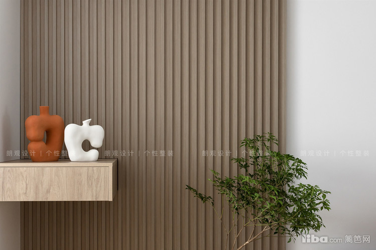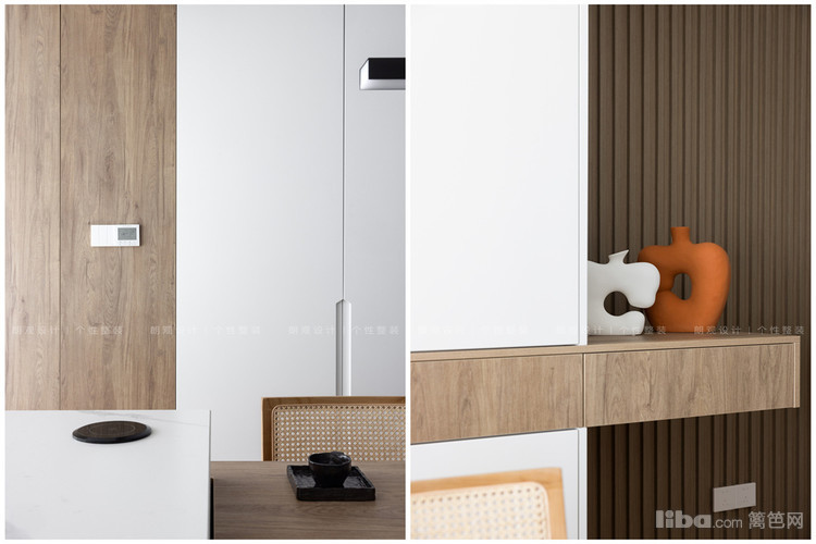 格栅护墙板和白色柜门背景搭配橙色的饰品做了撞色处理