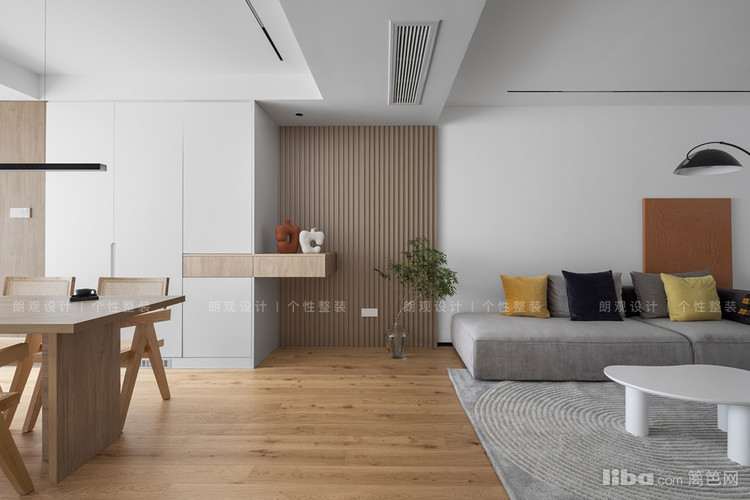 格栅护墙板是整个客厅的一小抹亮点,视觉上分割了客餐厅的区域位置