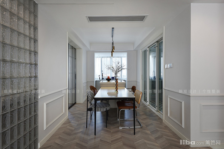 餐厅在延续法式风情的基础上,更加注重实用性,北阳台改为西厨,形成中西厨兼具的用餐区。软装仅用几株雪柳唤醒整个餐厅,营造唯美的用餐氛围。