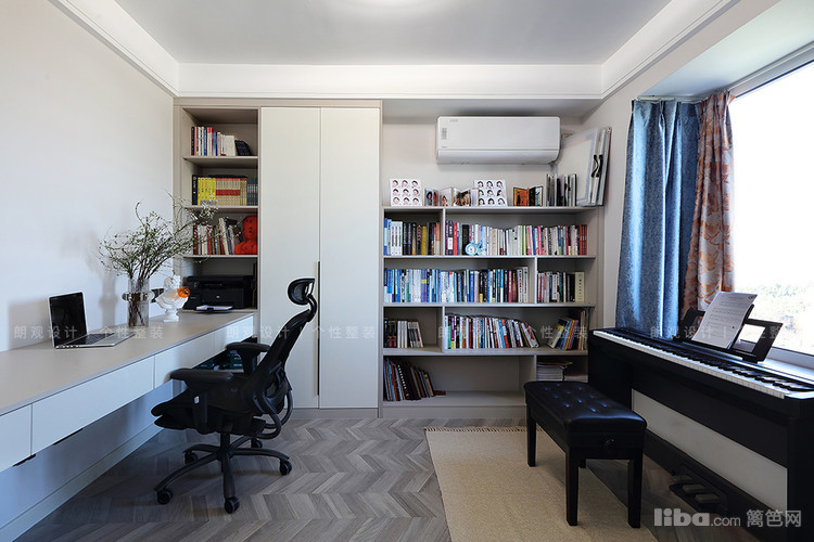 书房承担起一家人的工作学习,超长书桌既可以满足男主工作需求,也能用于监督女儿写作业。开放式书柜整齐排放着各类书籍,方便查找拿取。