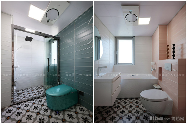 客卫湿区用到了白绿撞色,为小空间增添时尚复古韵味。主卫满满的浪漫气氛,浅粉色墙砖,静享品质生活。