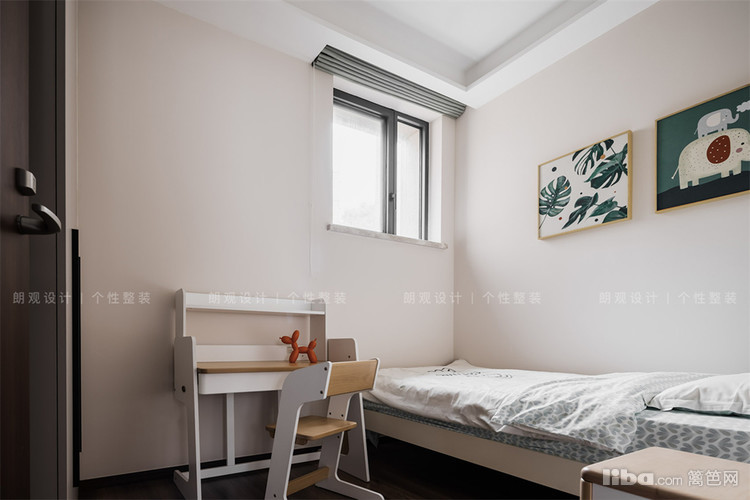 儿童房由主卧改造而来,面积虽小但功能齐全。以浅色为主,墨绿色画进行跳色处,为房间注入活力和童趣。