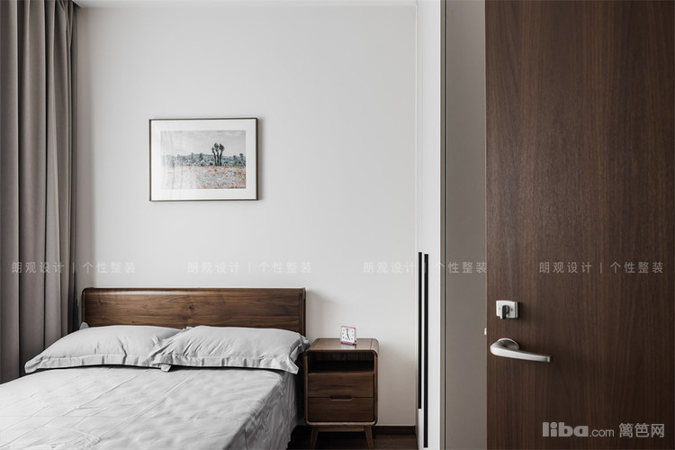 电视背景墙以木纹护墙板修饰,借助护墙板的可塑性将主卧套门隐形处理,保持墙面和空间的完整性。