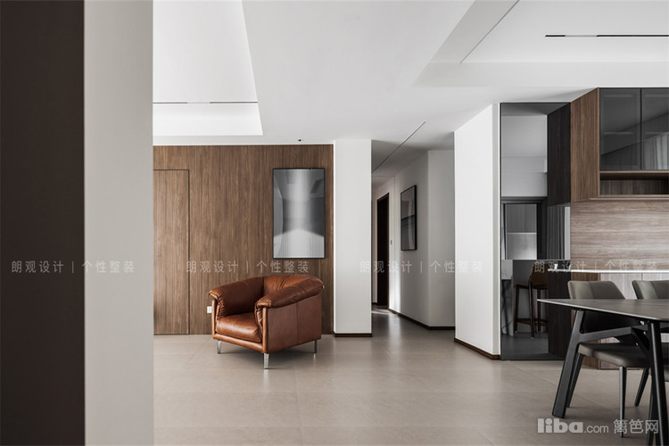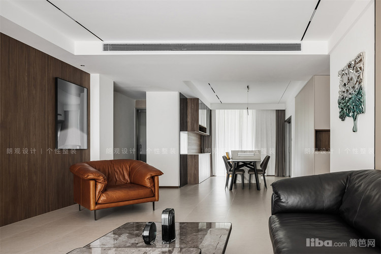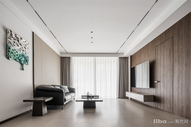 客厅在简约的空间里融入了木元素,电视背景墙以木纹护墙板修饰,借助护墙板的可塑性将主卧套门隐形处理,保持墙面和空间的完整性。