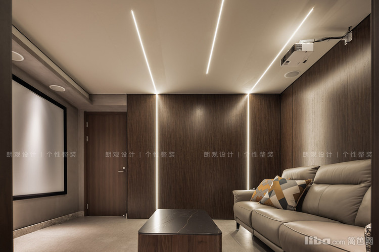 嵌入式灯带从墙面延伸至顶部,木纹饰面和微水泥特殊纹路的融入,营造出一种现代感和科技感结合的炫酷视觉。