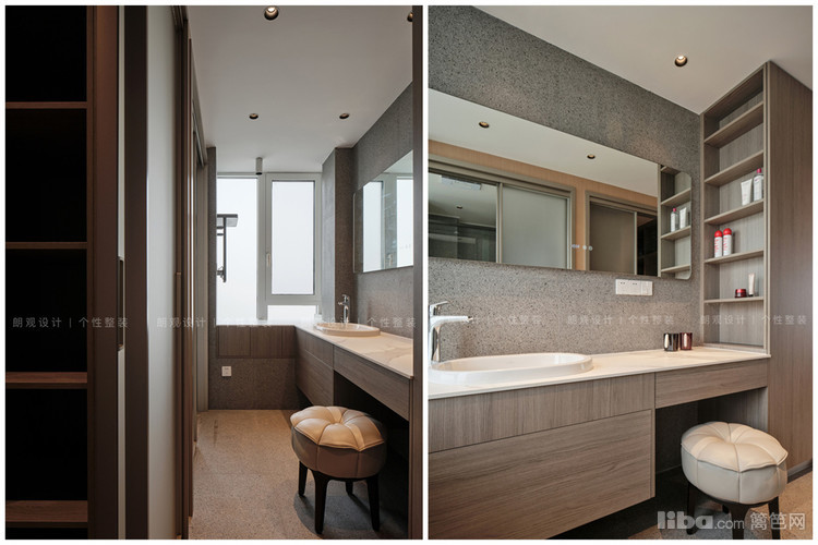 主卫经过改造后实现干湿分离设计,干区将洗漱池和化妆台二合一,侧面的储物格方便女主人化妆品收纳;