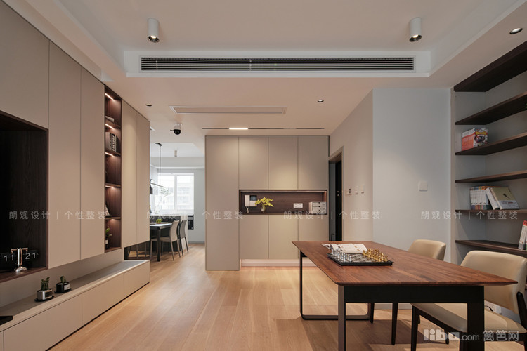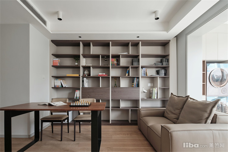 客厅一整面开放式书柜避免封闭空间带来的压迫感,整个设计完全摈弃了传统模式,实现客厅功能多元化,既满足会客聊天又能兼顾工作阅读,既有强大的收纳空间又有书卷气的格调。