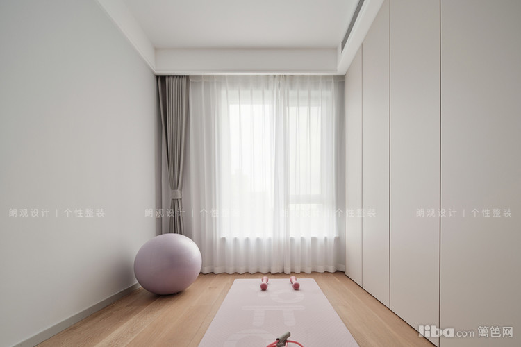 室内硬装简约大气,仅以浅灰色乳胶漆为基底,搭配顶天立地的柜体,实现储物与健身的双重功能。