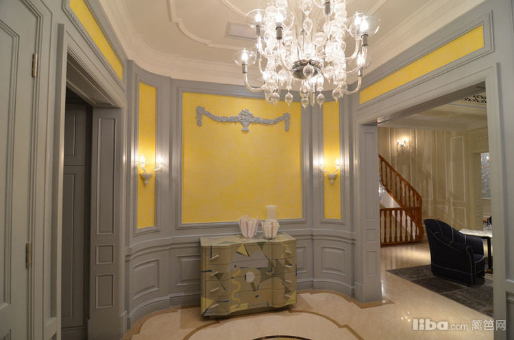 进厅处大胆的用了色彩碰撞,鹅黄色与灰色护墙板搭配,还有华丽丽的水晶灯,让主人一进家门就能感受到轻松和愉悦