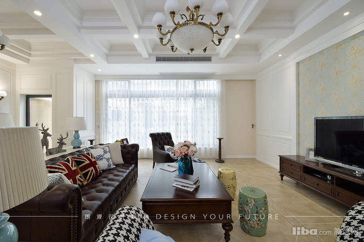 客厅区域以白色为主基调,美式风格的护墙板、壁炉、以及吊顶的九宫格的设计完美的呈现了美式风格的大气和别墅的大空间