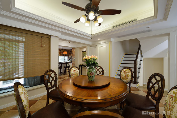 餐厅与客厅之间的跃层让整个空间更加通透,并且与厨房打通,让家人可以更好的互动,地砖采用暖色仿古砖,给人以家的温馨感