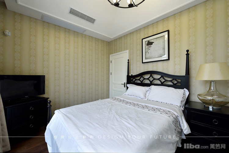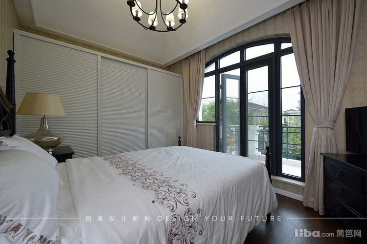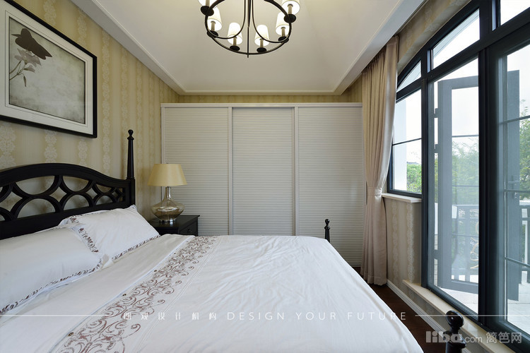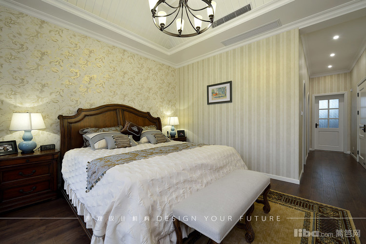卧室位于顶楼,层高较高且是异性,所以顶掉都做了处理,墙面则以简单的墙纸装饰,配以铁艺吊灯,美式韵味呼之欲出!