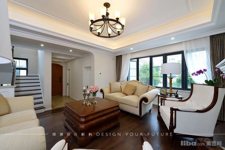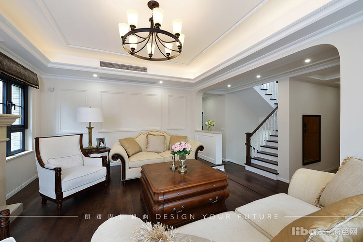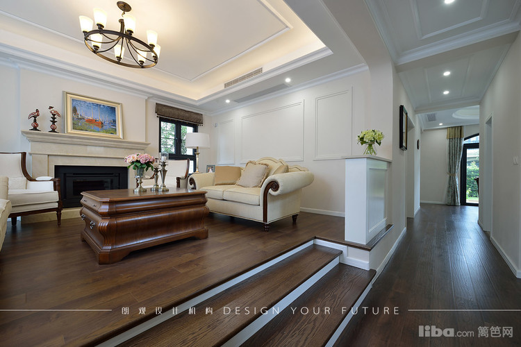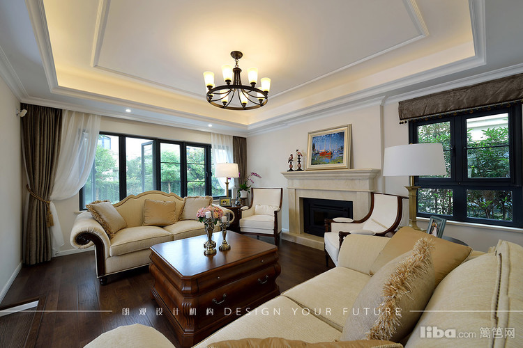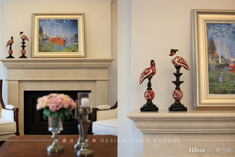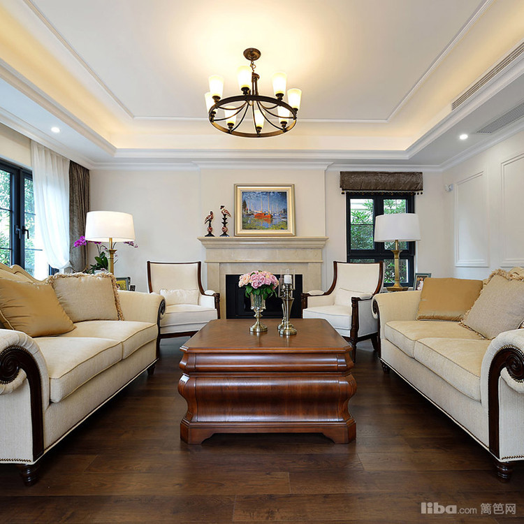 客厅跳出常规的布局,沙发面对面摆放,大理石壁炉则作为分割,让整体布局感觉紧凑和谐。吊顶的造型相对简单,主要以石膏线来凸显美式风格。