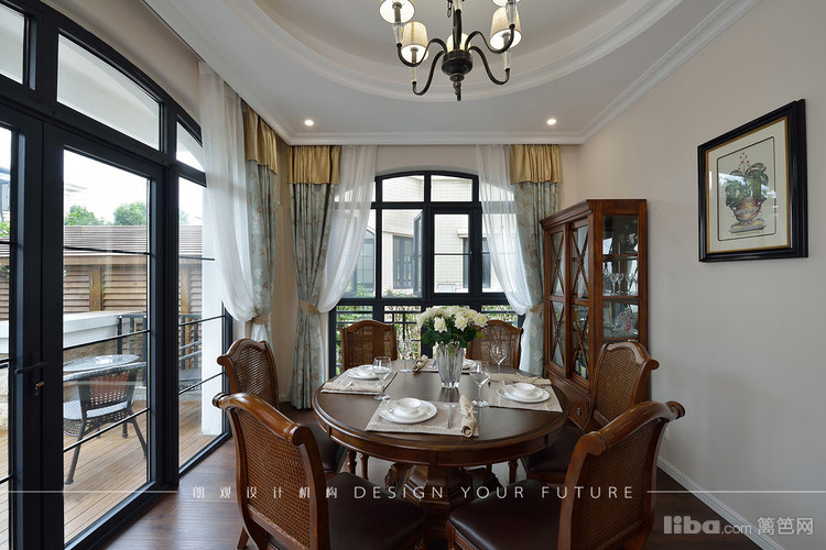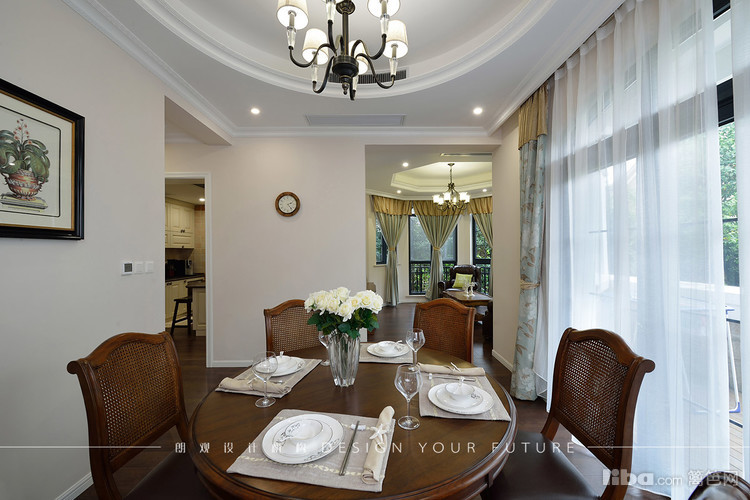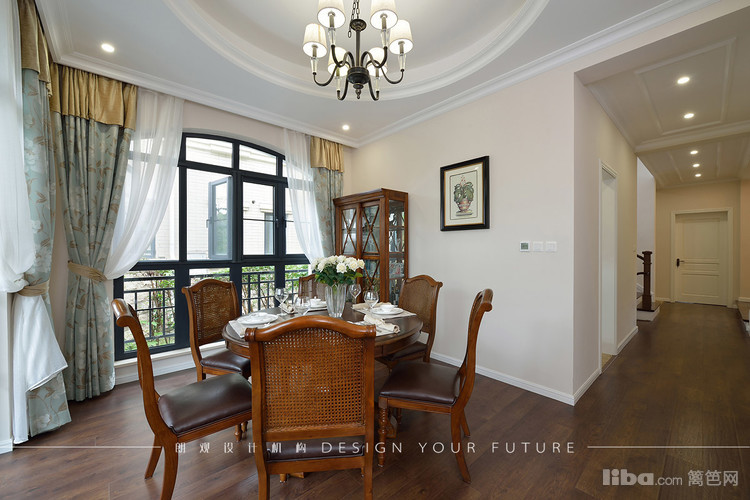 餐厅采用圆形餐桌与圆弧形吊顶形成呼应。