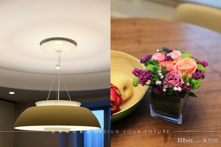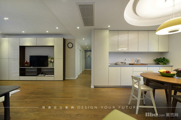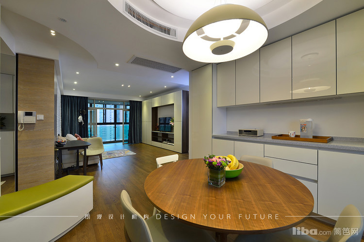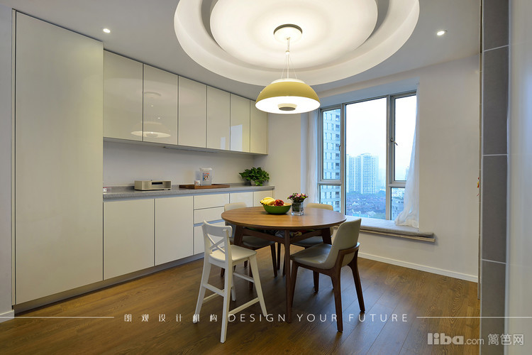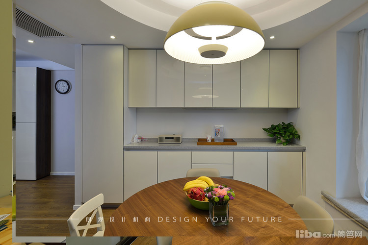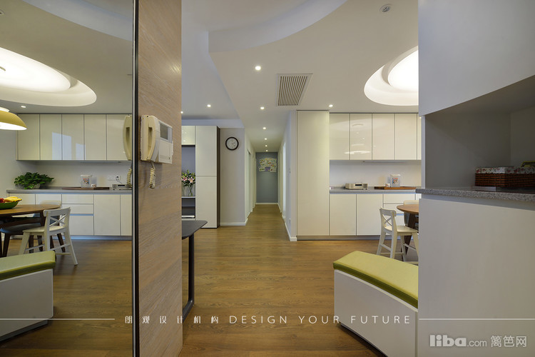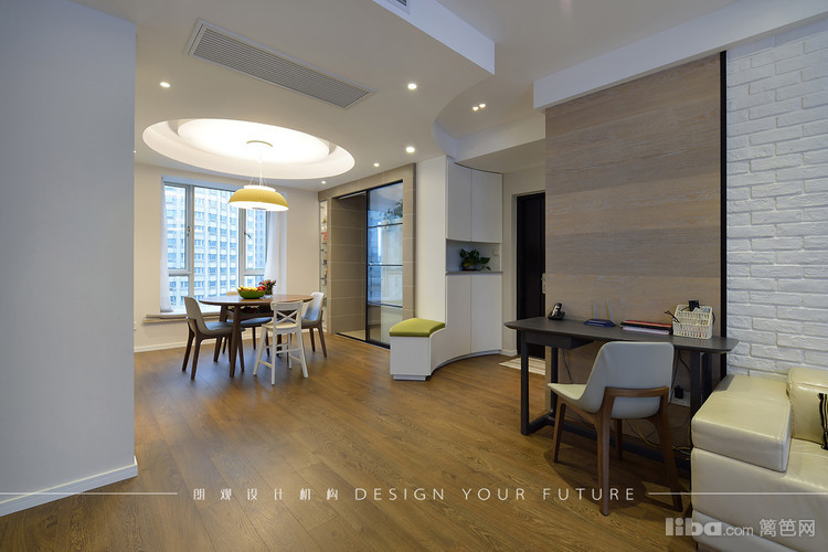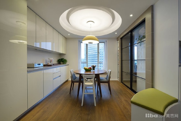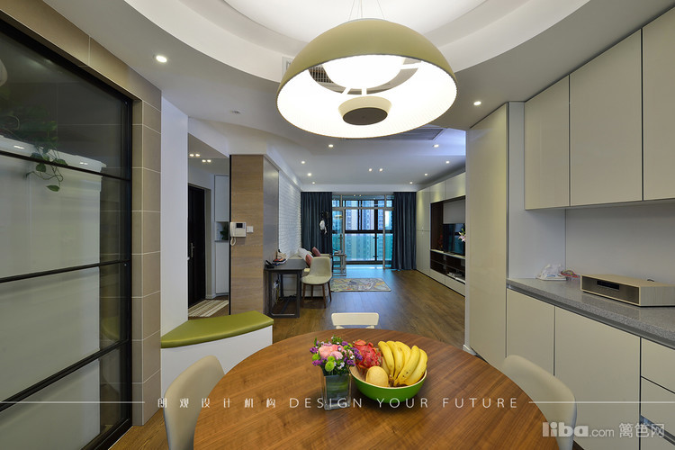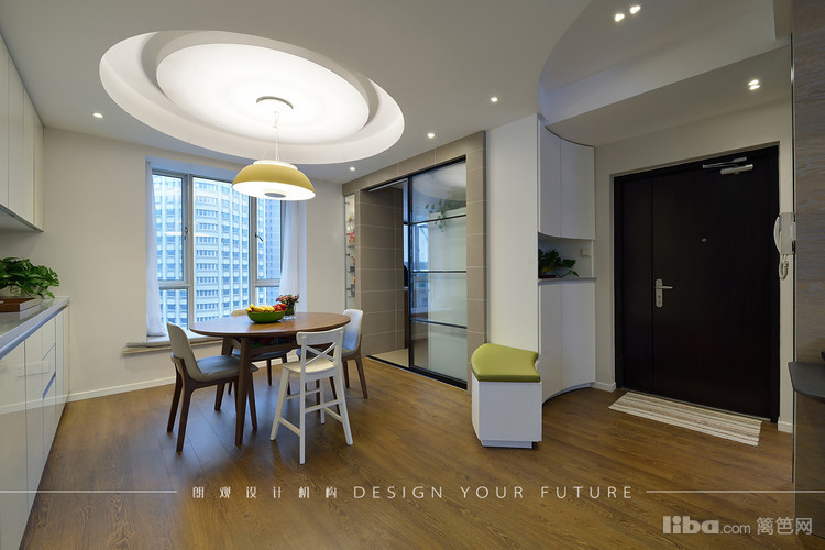 餐厅采用圆形餐桌,吊顶也做了圆弧形的形成呼应,餐边柜做了整面墙,最大限度的满足储物需求。进厅处的穿鞋凳方便了使用,也成了进门的亮点