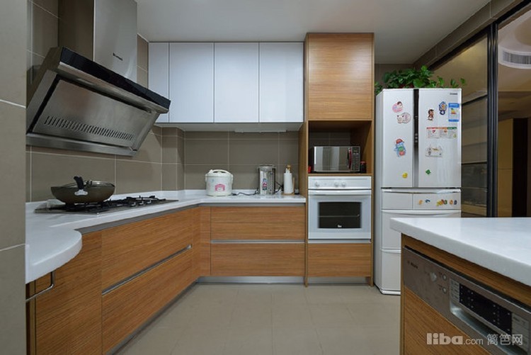 厨房橱柜采用简约的造型,U字型布局增加了储物空间和操作空间