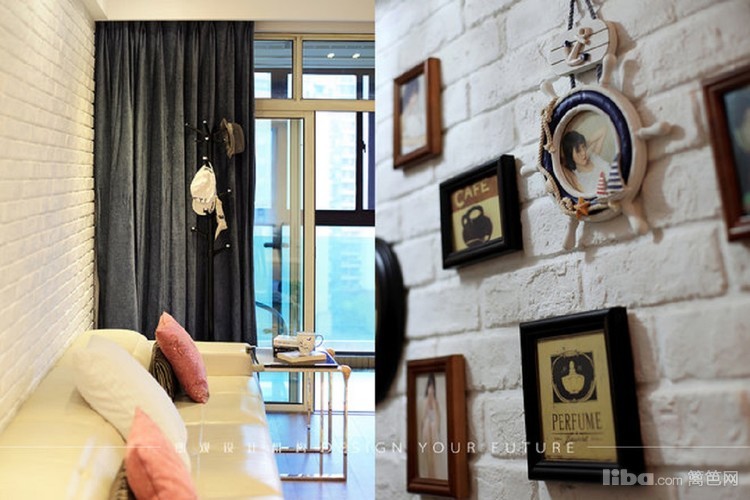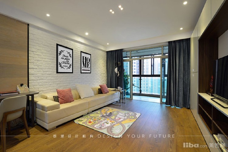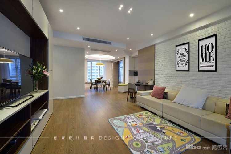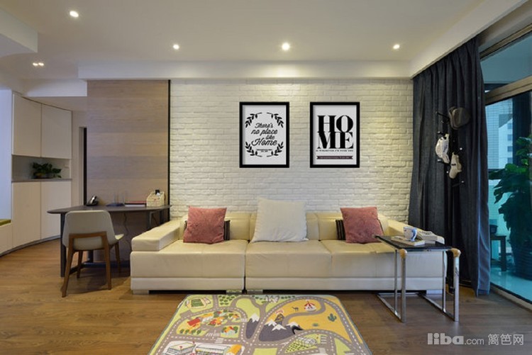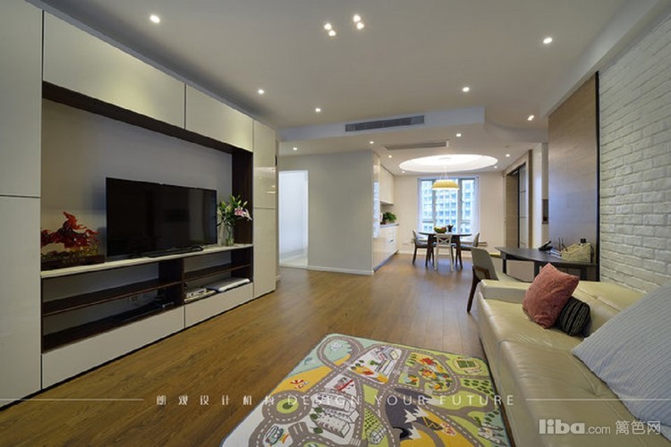 客厅电视机柜做成一面装饰墙,简单时尚又很实用。沙发背景墙采用毛砖处理,另类的时尚