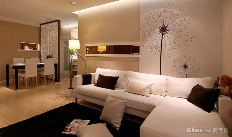 浅色的布艺沙发+黑色地毯,墙面茶镜装饰,蒲公英墙纸点缀,让整体感觉清新自然时尚