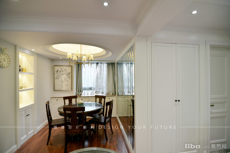 餐厅采用圆桌,圆形吊顶与之形成户型,车边镜装饰的背景墙则是为了增加空间的通透性,让视觉上有宽敞感。