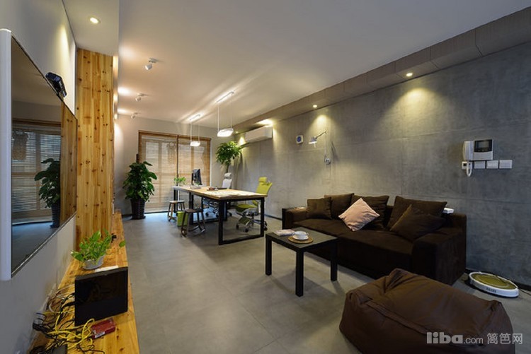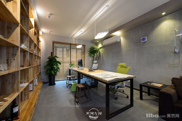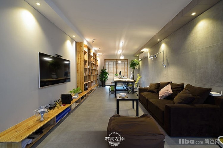 水泥色墙面与地面形成统一,杉木板做成的展示柜,简单但很实用,loft风格在不经意间流露。