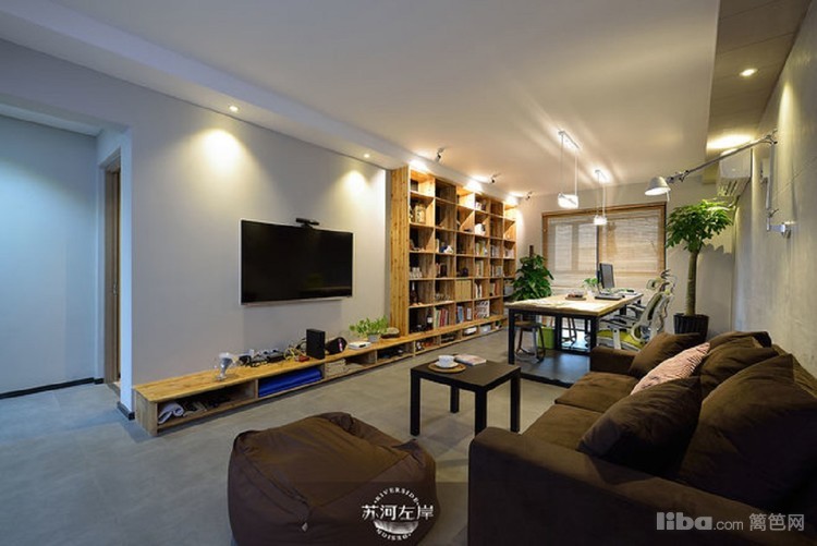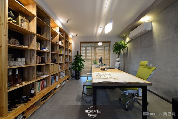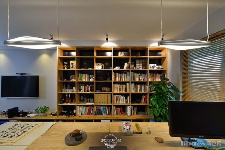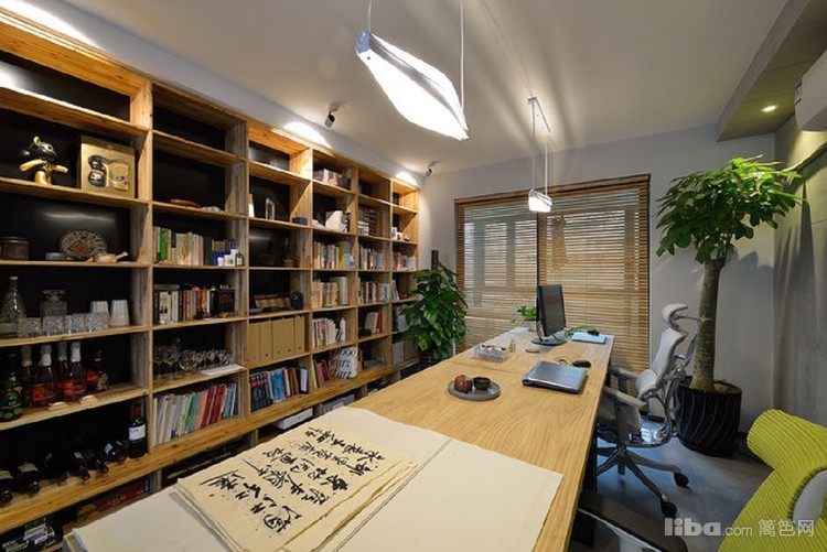 书房区域敞开式到顶的书柜,造型简单但有着强大的储藏功能。