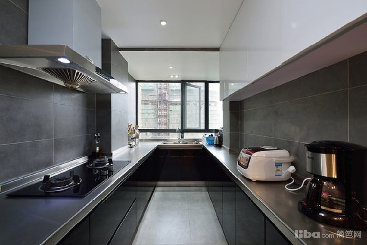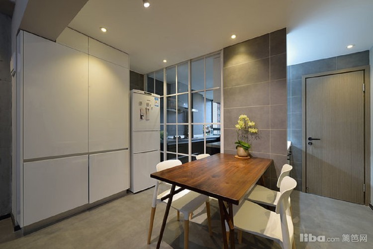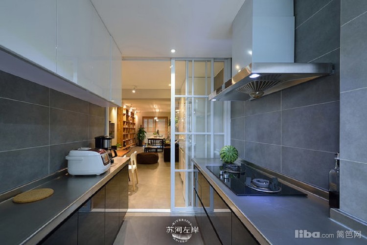 厨房也是采用黑白灰的色调,白色的玻璃隔断让厨房与餐厅区域隔而不断。