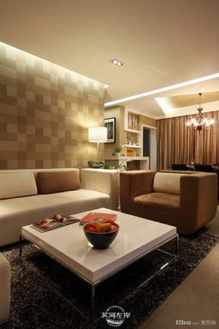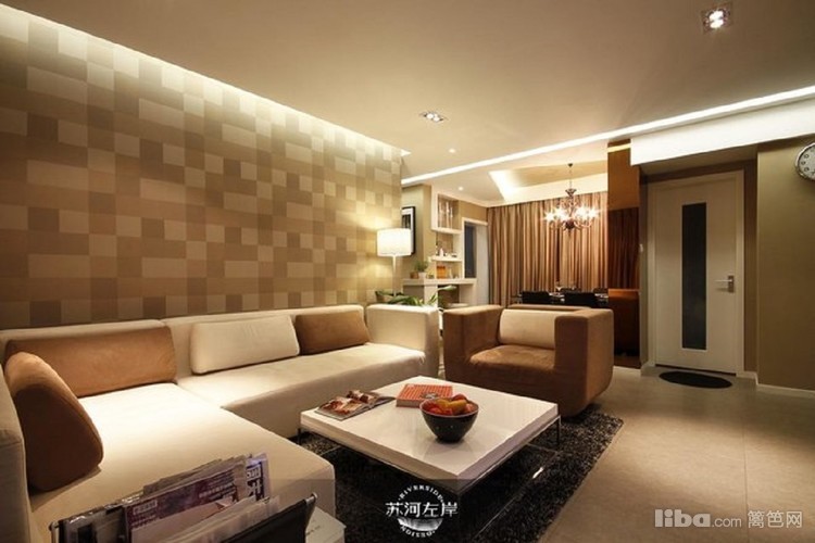 咖色的墙纸,咖色的沙发,还有咖色的窗帘,形成整套风格色调的同意。几何形状的图案彰显时尚个性空间。