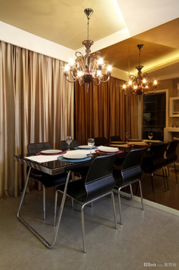 黑色的餐座椅与暖色调的蜡烛吊顶烘托出低调奢华的温馨氛围。