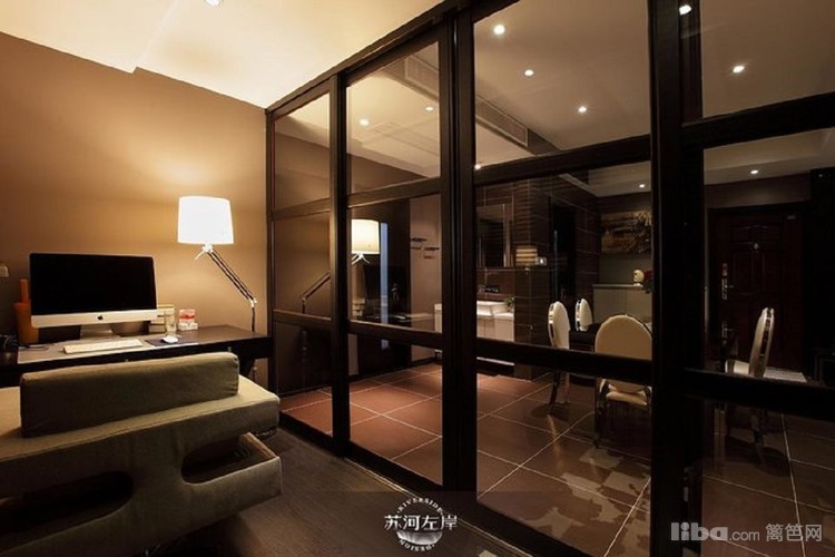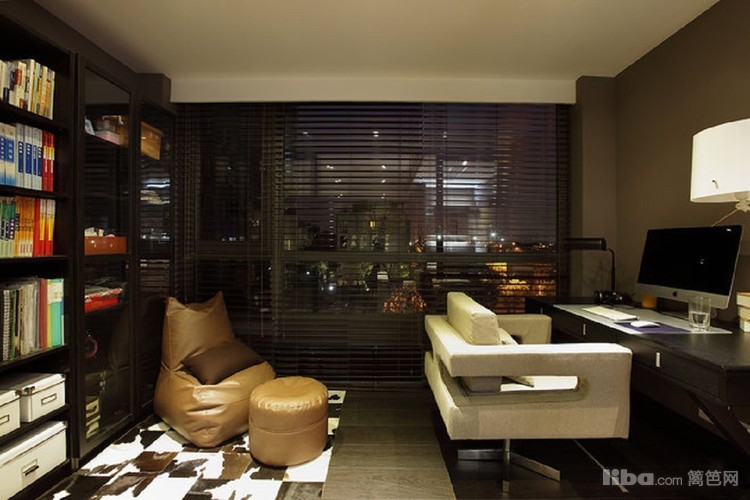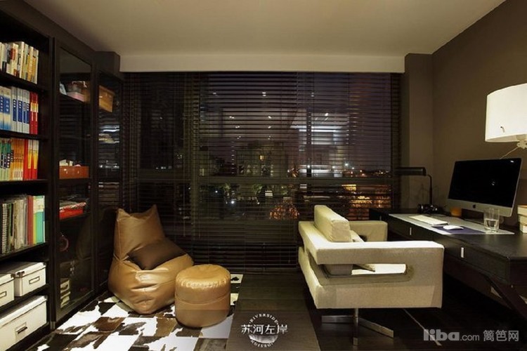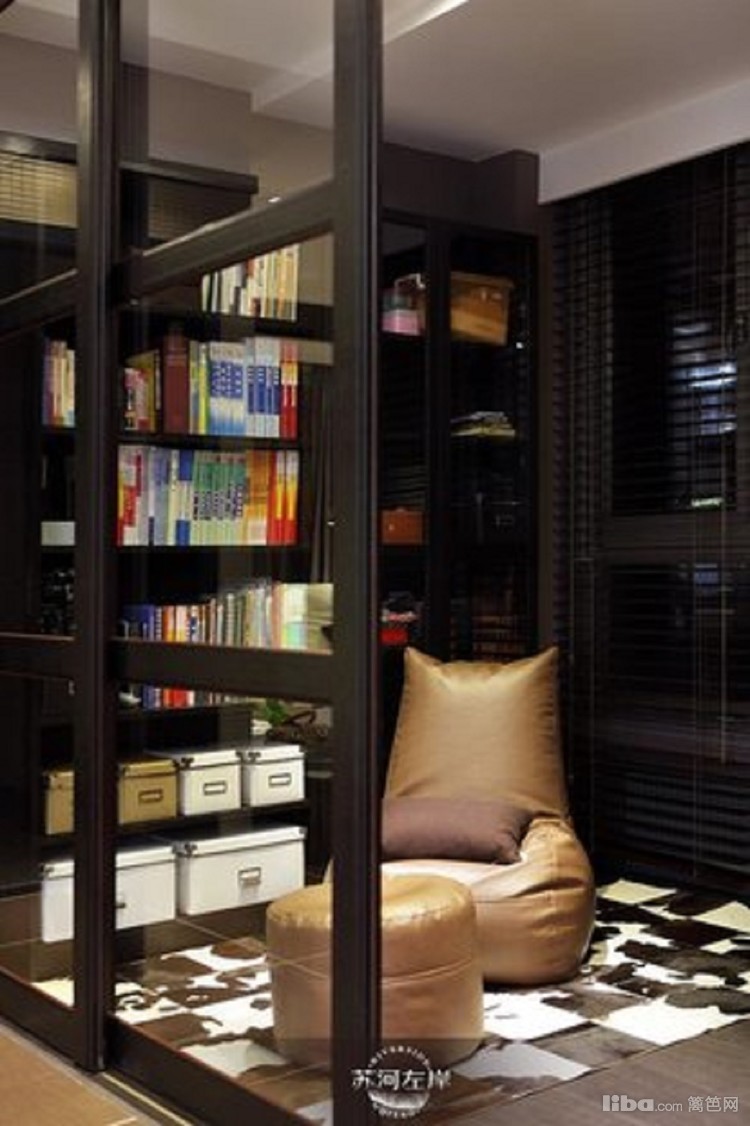 书房书柜和隔断移门都是采用黑色边框,与浅色沙发搭配,营造个性的思考空间。