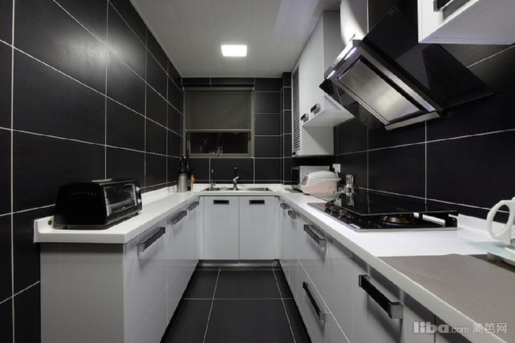 厨房白色橱柜配黑色墙地砖,简洁但很大气。