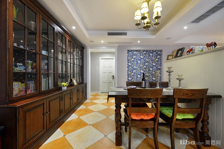 餐厅边利用过道的位置放置了一排书柜,合理的增加了藏书空间,书柜与餐桌椅也都是美式的实木款