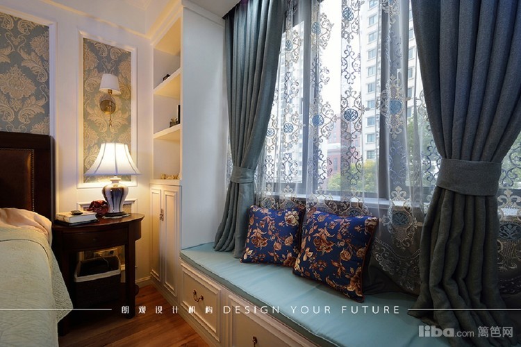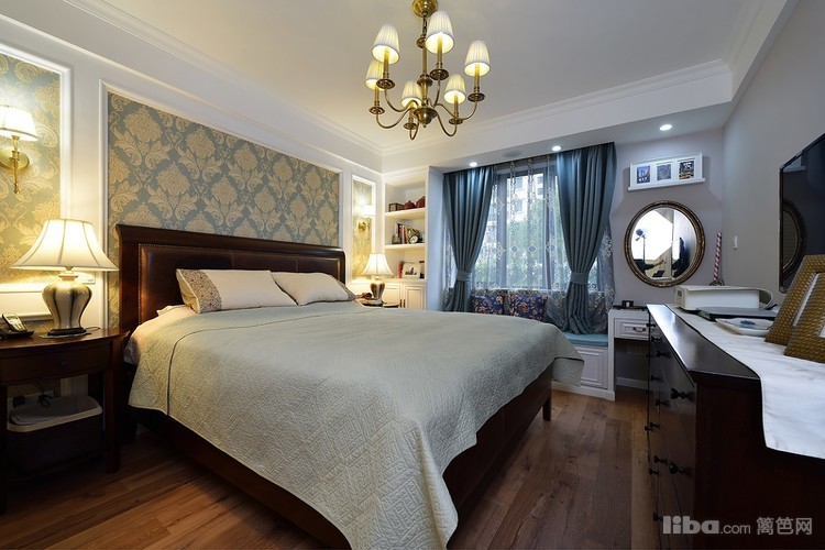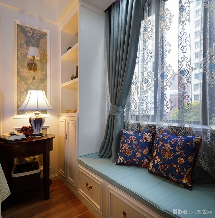 主卧的亮点在于床背景墙的制作,墙纸画龙点睛,飘窗的设计增加了储物空间,也是午后休闲小憩的地方,与两边的壁柜形成了一个整体,装饰与储物两不误~