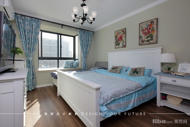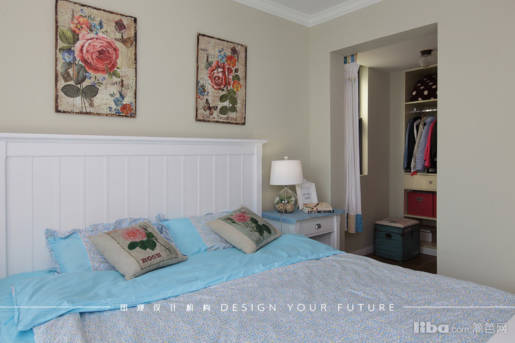 主卧白色床与整体风格高度协调,装饰画以热烈的玫瑰来提亮整个空间。