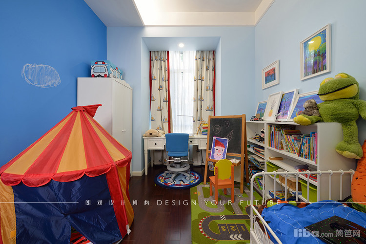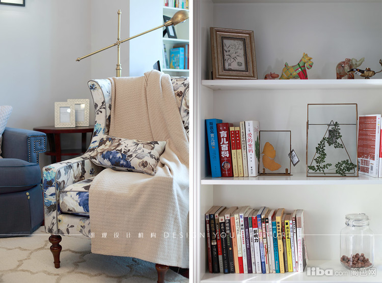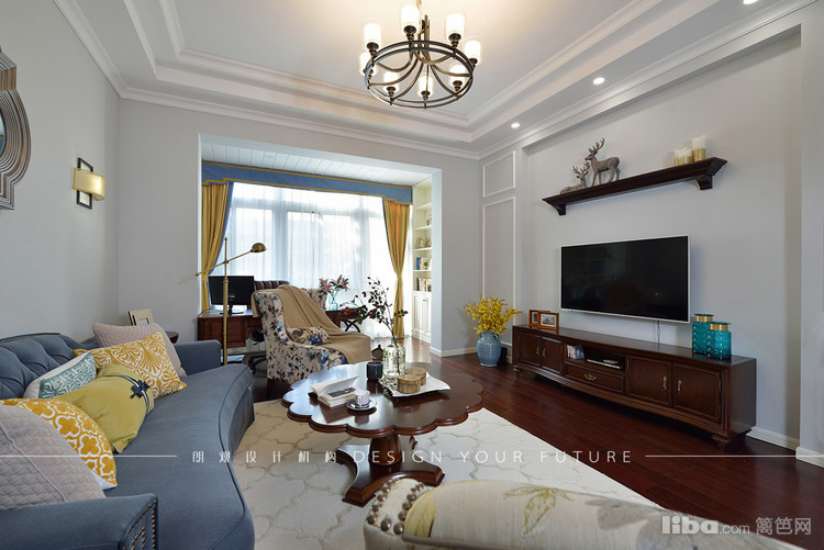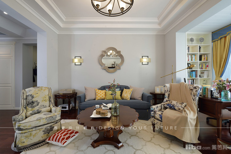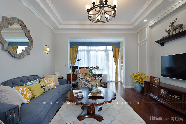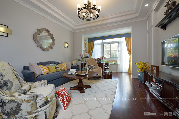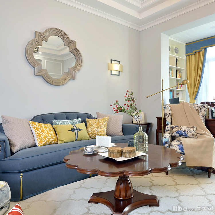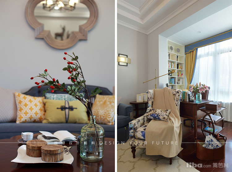 清新的简约美式也许您见过很多,但是像本案这样大胆运用撞色的估计不多见~柠檬黄的窗帘和抱枕,宝蓝色的沙发和花瓶都形成了呼应和视觉上的冲击!