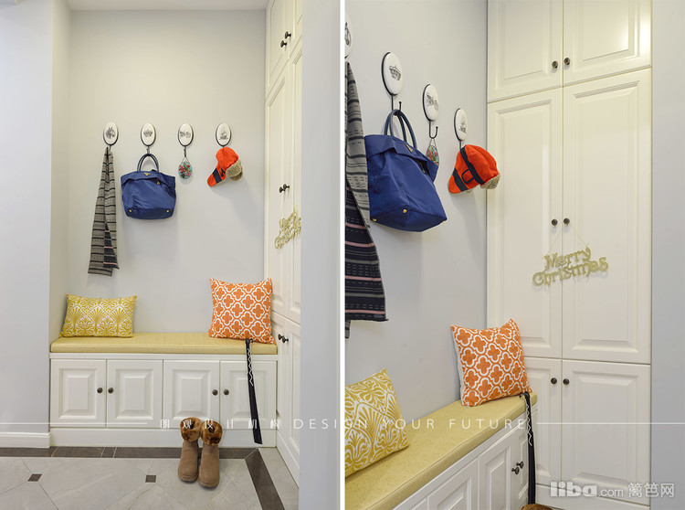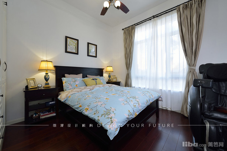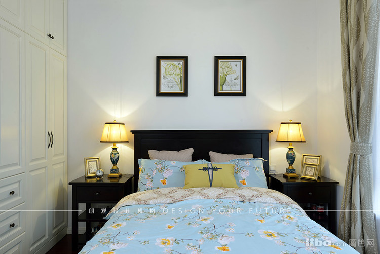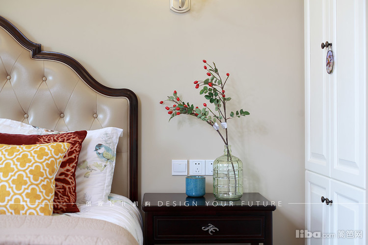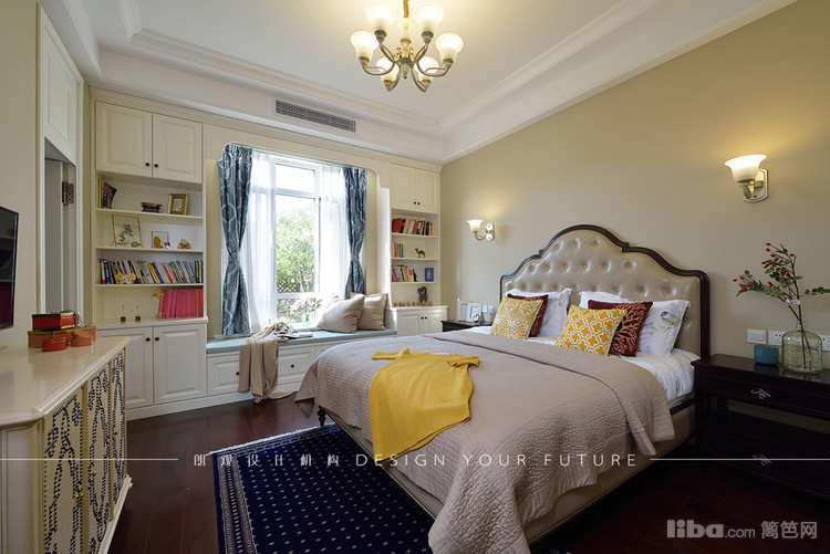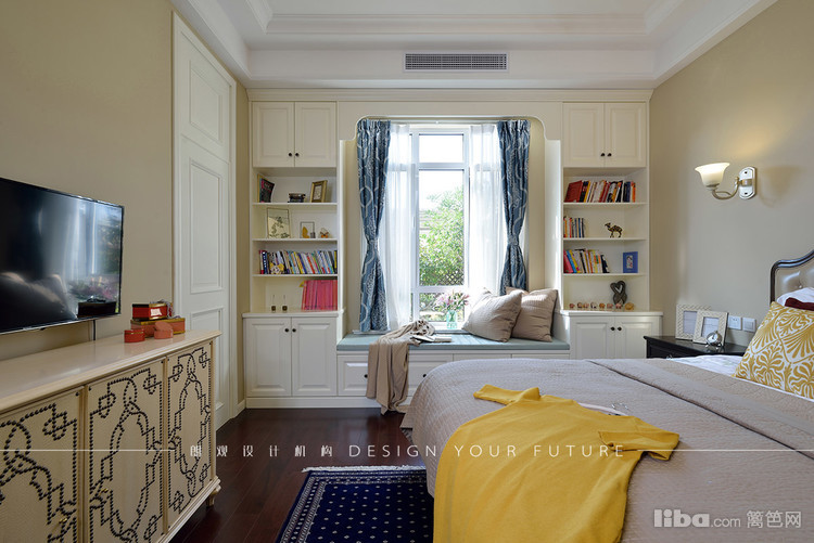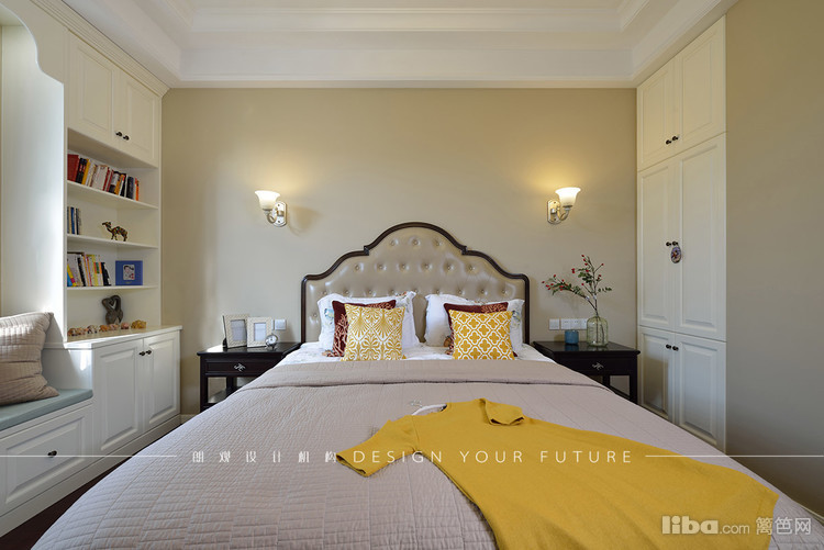 卧室依旧采用经典的美式家具,主卧充分考虑了储藏空间,做出了飘窗和书柜以及到顶的大衣柜,柠檬黄的抱枕和连衣裙恰到好处的形成了呼应,同时也显示出女主的用心和阳光。