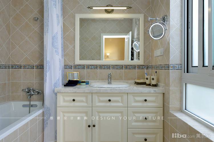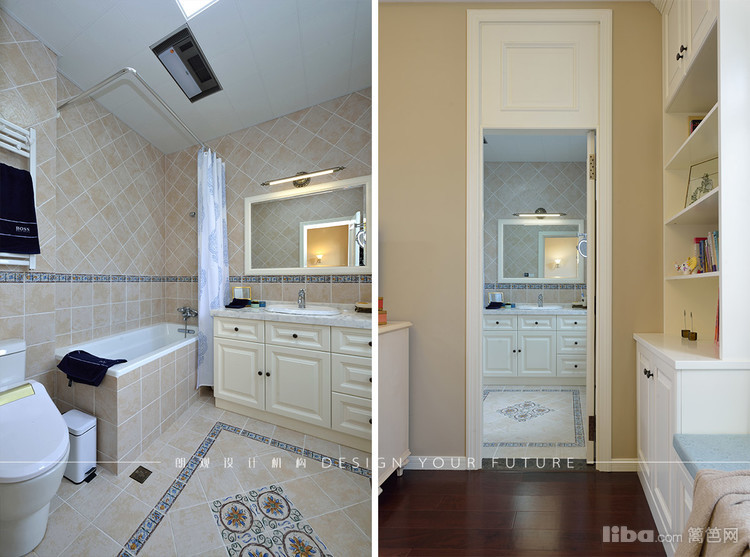 主卫门头采用加高的做法,凸显了房子的高大,主卫内部实木的台盆柜和瓷砖腰线给人以精致考究的质感和生活品味