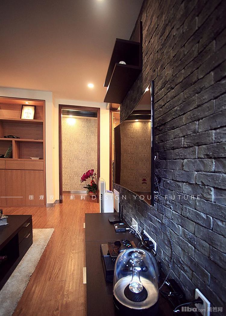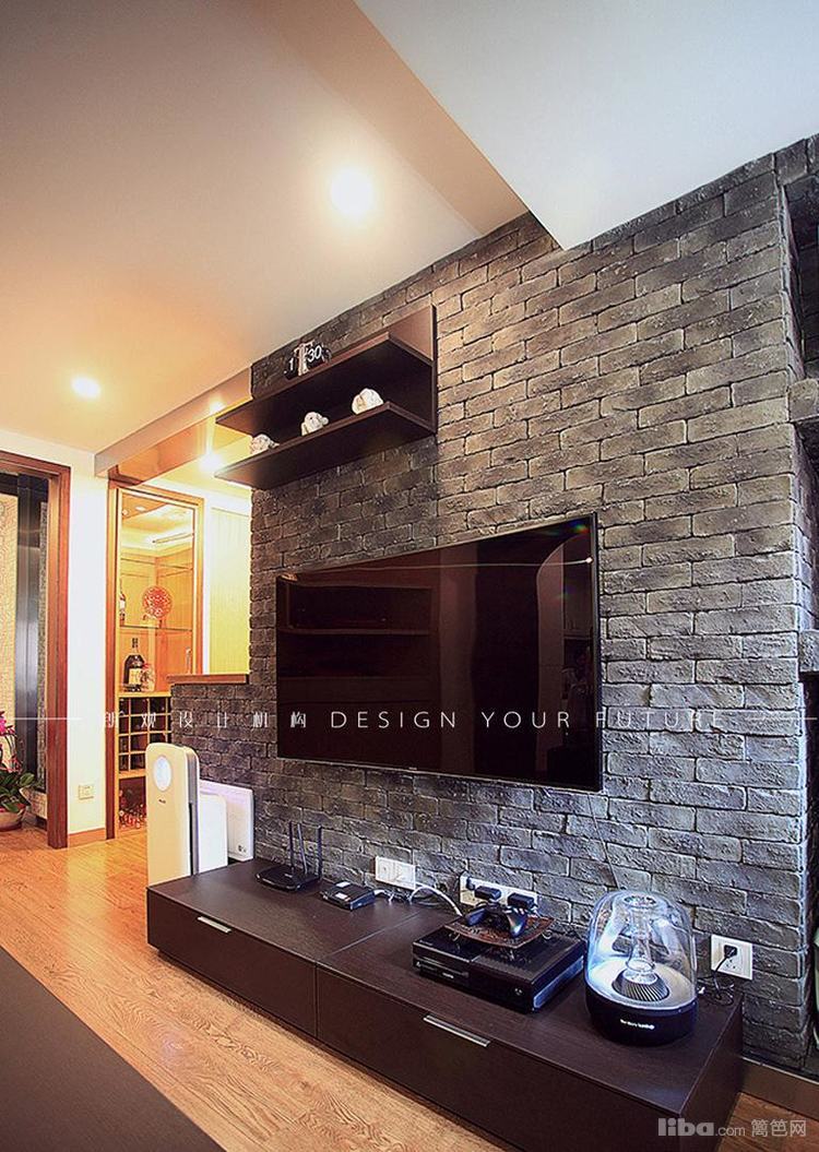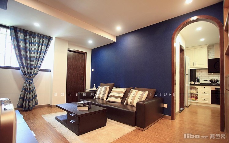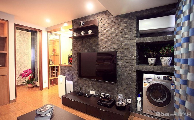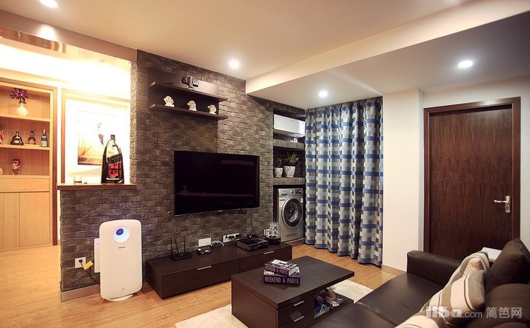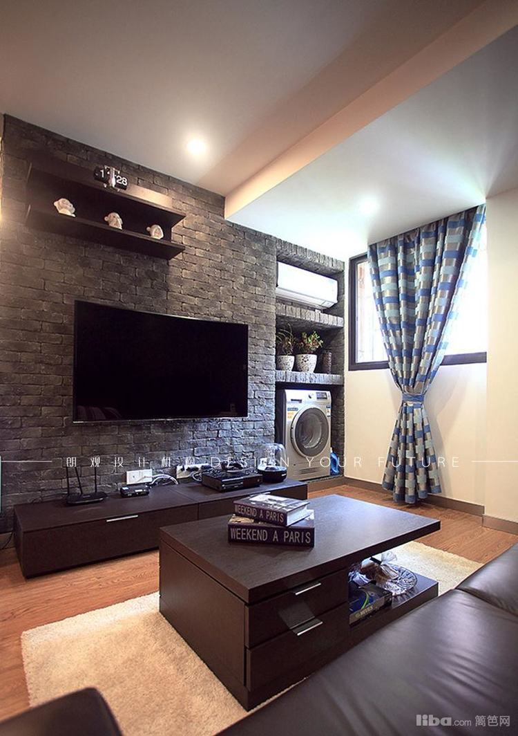 客厅青色毛砖与蓝色沙发背景墙,体现了色彩上的对撞。简约的黑色家具提升了整体质感。