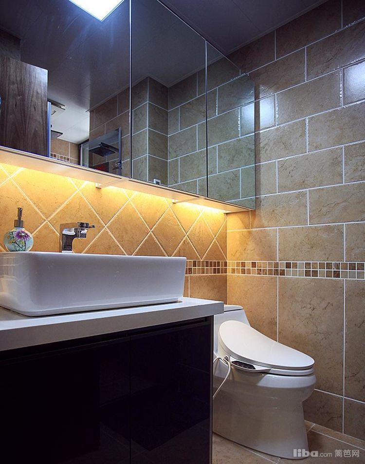 卫生间采用正铺和斜铺混搭,马赛克围边自然的过渡了不同铺法。