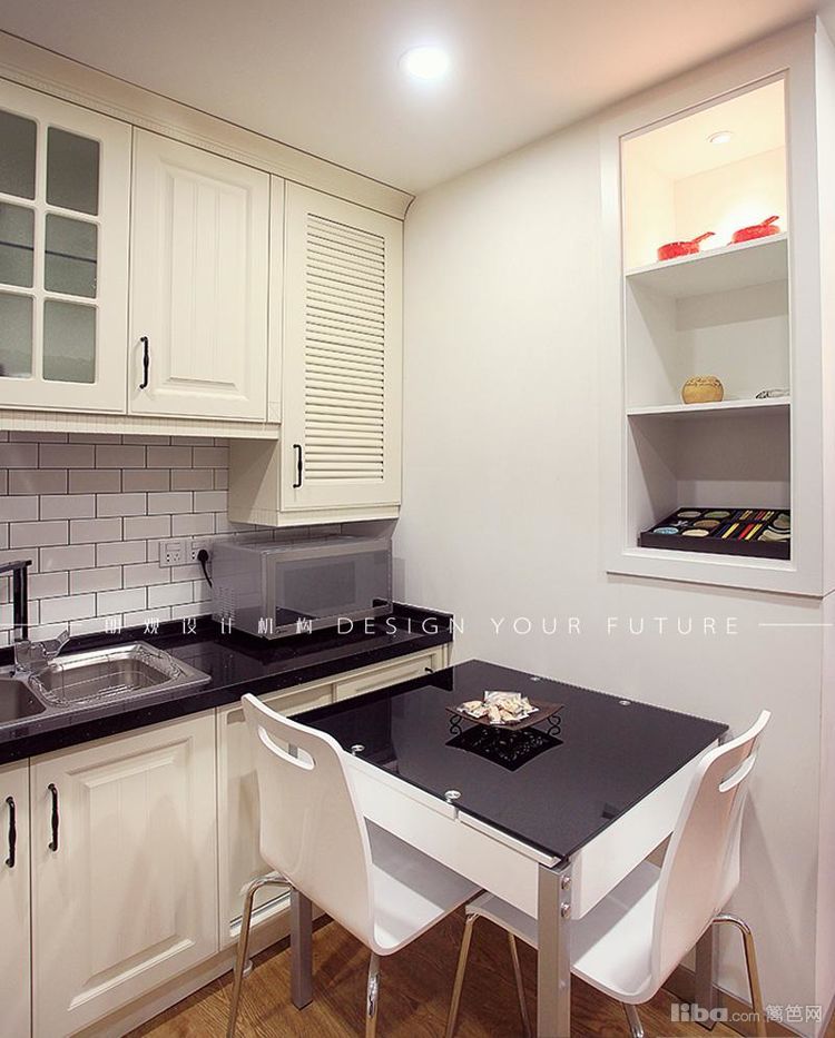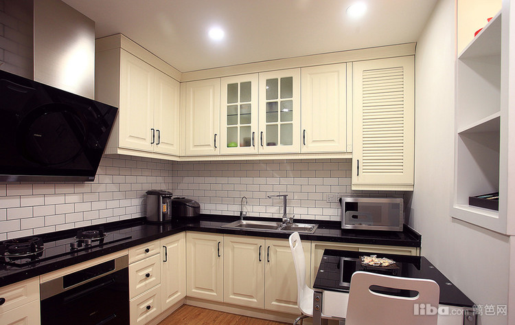 橱柜配以黑色台面,显得干净清爽,小白砖做出的工字贴更显精致。