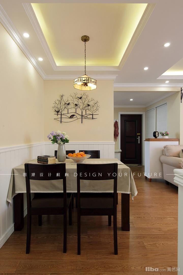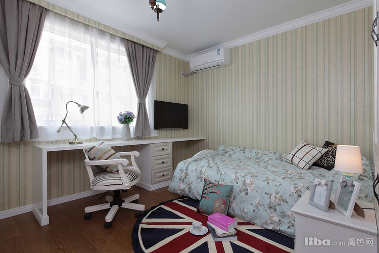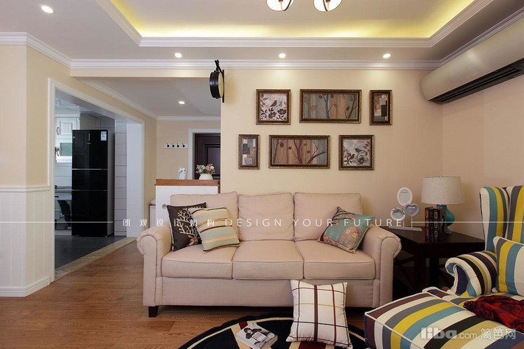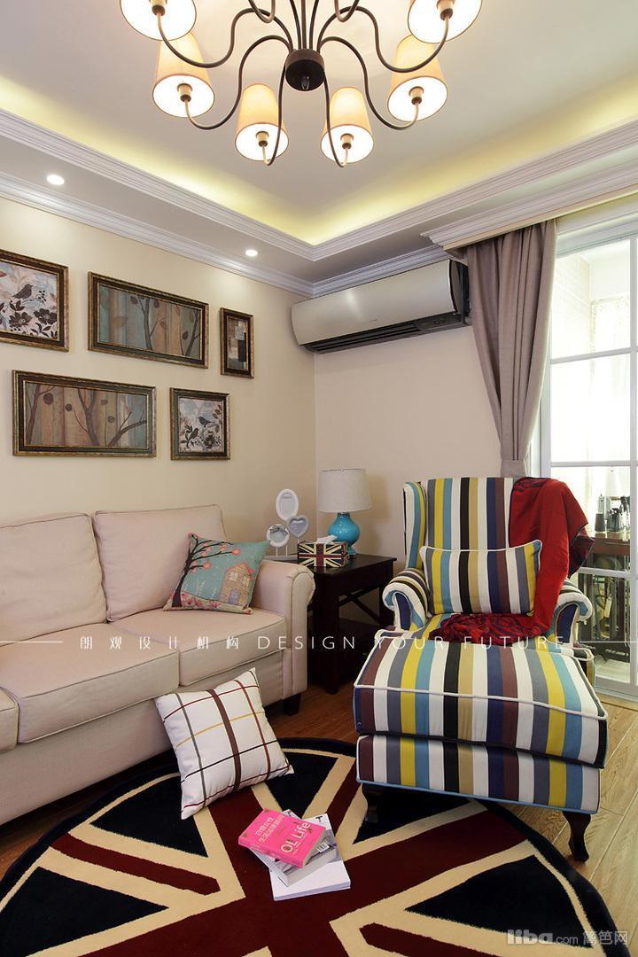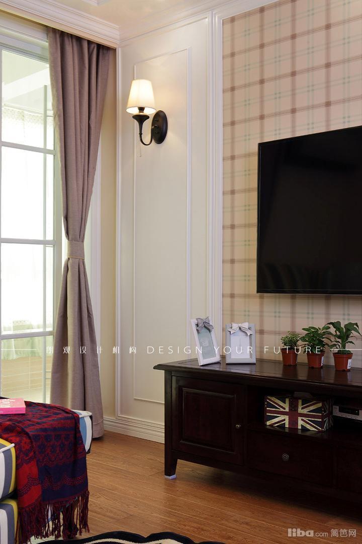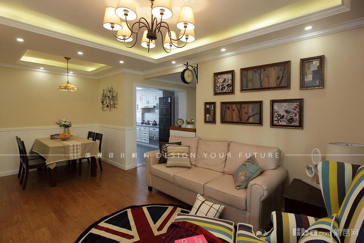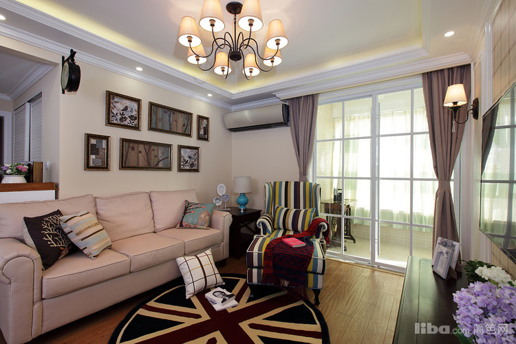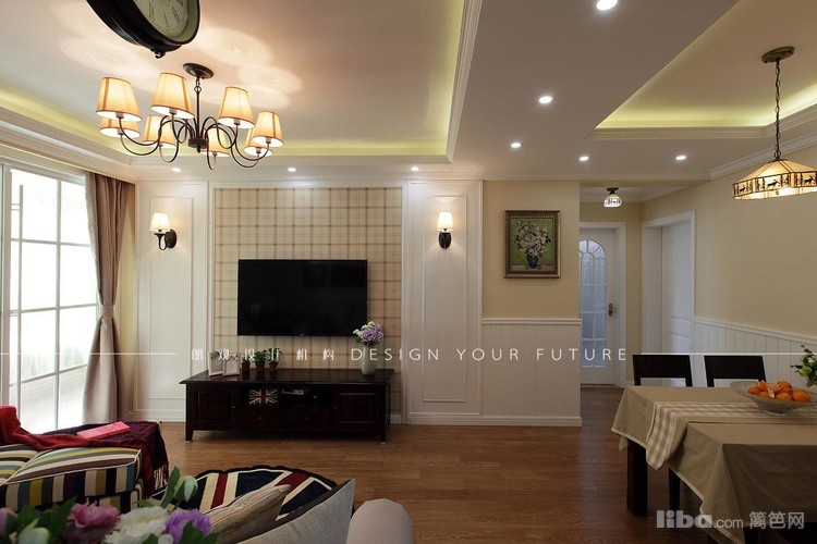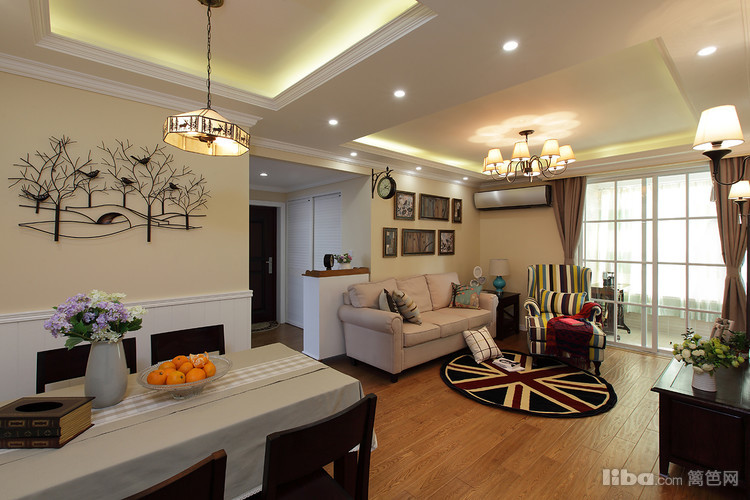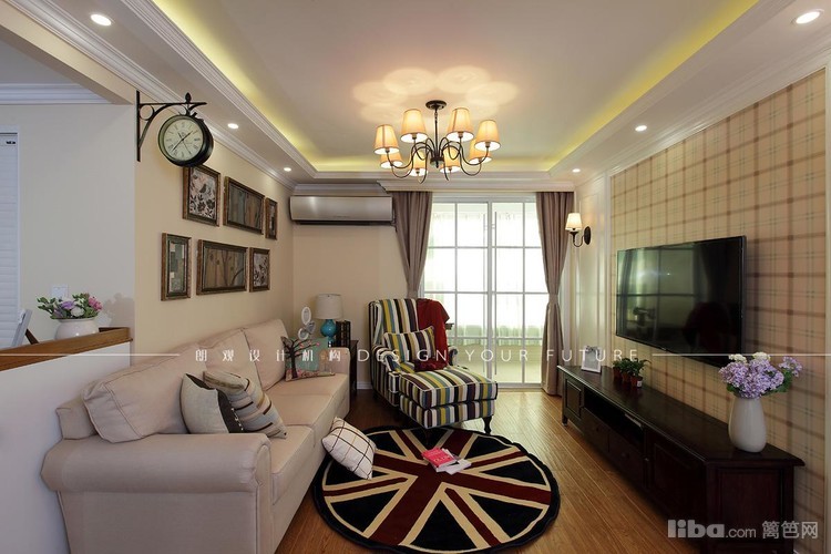 半腰护墙板、格子墙纸、米字旗、布艺沙发等融于一体,体现出简约美式的大气,又有英伦风范的高雅。