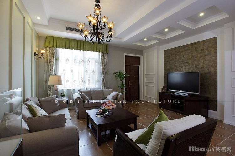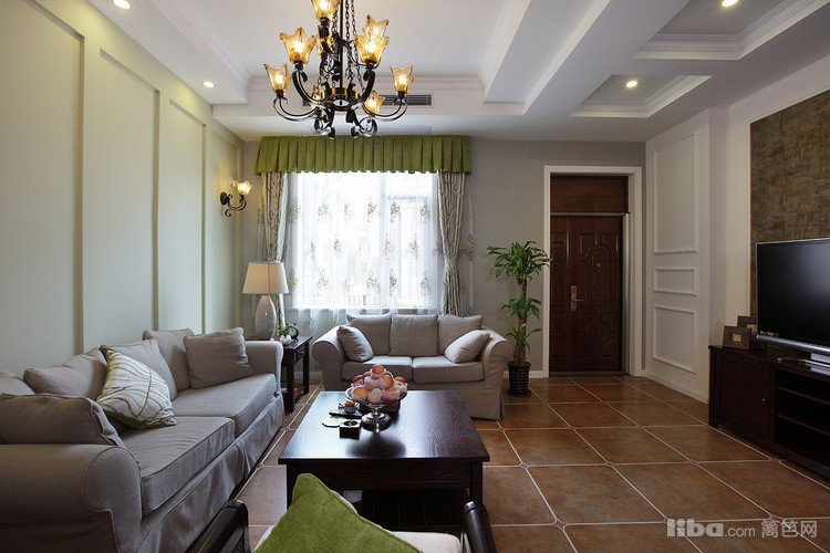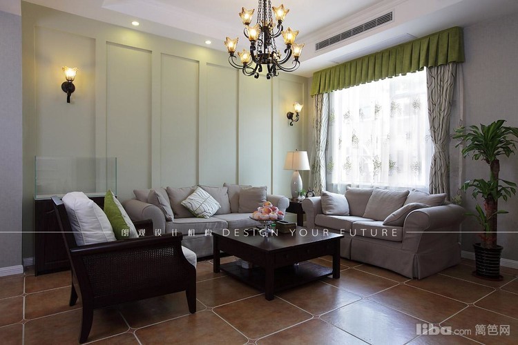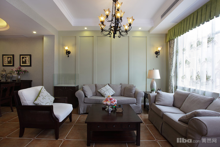 抹茶色的墙面配色简单的格子造型,浅色布艺沙发和深色藤椅,给人的感觉是简单大气舒服的感觉。