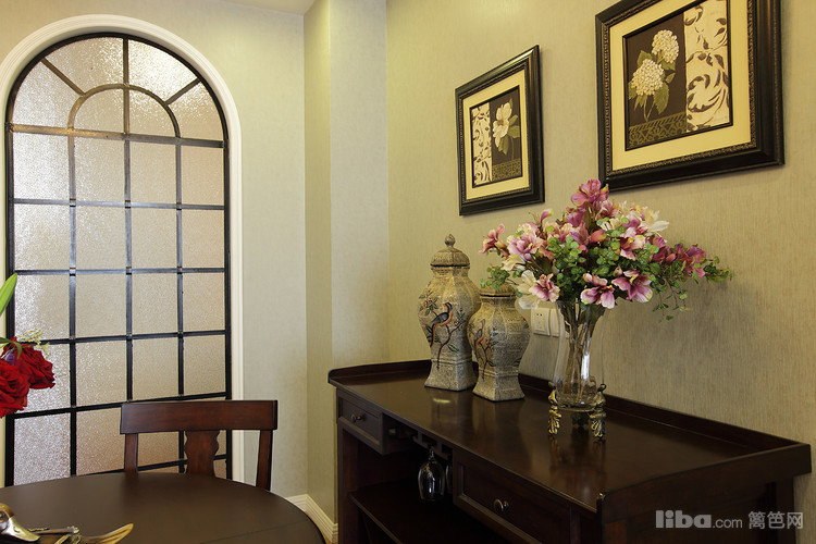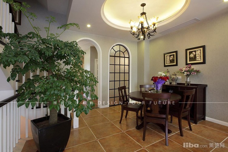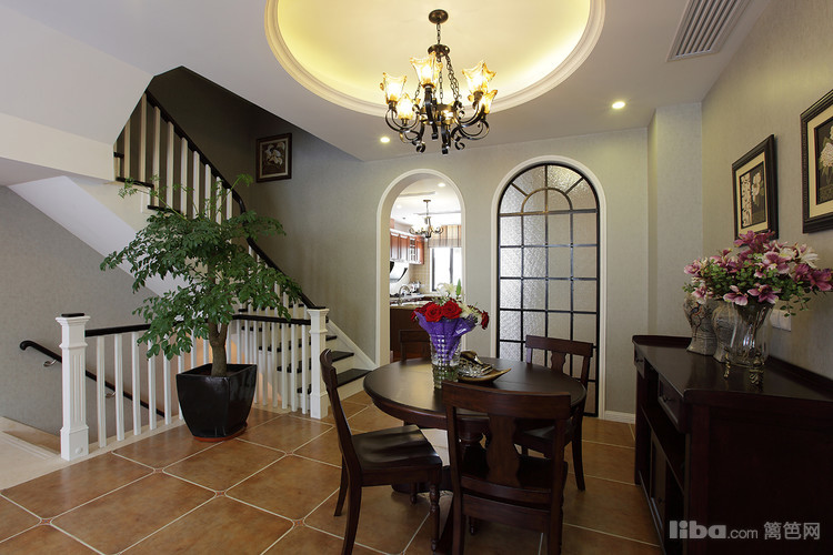 餐厅圆形吊顶与圆形餐桌形成呼应,拱形格子玻璃门则增添了一点老上海的感觉,同时也增加了餐厅的采光效果。
