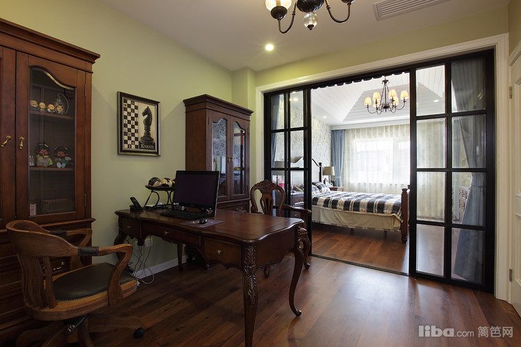 主卧和书房设计成一个套房区域,中间用黑色的玻璃格子门来隔断,使得整个空间隔而不断,更加灵活。